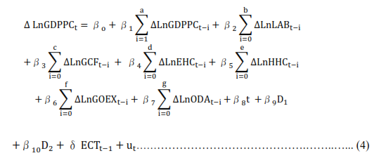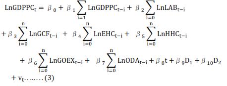 LnGDPPCt = f(LnLABt,LnGCFt,LnHHCt,LnGOEXt,LnODAtD1,D2)…..