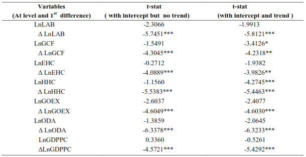 The results from this test show that six of the variables are non-stationary in their levels while the null of non-stationarity is not rejected for one variable (health human capital- with intercept and trend) at 5 % level of significance. On the other hand, in their first differences, all of the variables are stationary. These results indicate that, with intercept and trend, six of the variables are I (1) and one of them is I (0). Such results of stationarity test would not allow us to apply the Johansen approach of co-integration. This is one of the main justifications for using the ARDL approach developed by Pesaran, Shin, and Smith (2001).