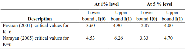 F-statistic value is compared with the lower bound and upper bound critical values tabulated in Table CI (III) case IV of Pesaran, Shin, and Smith (2001) and Appendix-X case V of Narayan (2005).