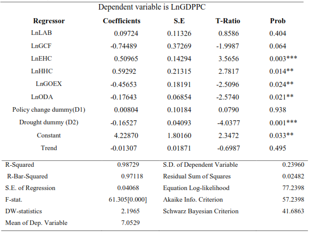 As it is shown in Table-4, the estimated coefficients of the labor force, health human capital and education human capital, policy change dummy and drought dummy have the hypothesized signs while gross capital formation, government expenditure and official development assistance have unexpected signs.