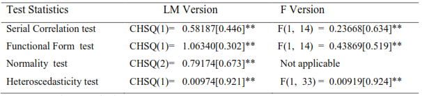 Note: The sign ** indicates the significance of each diagnostic tests at 5% level of significance. The test for serial correlation is the LM test for autocorrelation, the test for functional form is Ramsey’s RESET test, the test for normality is based on Jarque-Bera test, and the test for heteroskedasticity is based on Breusch-Pagan- Godfrey test.