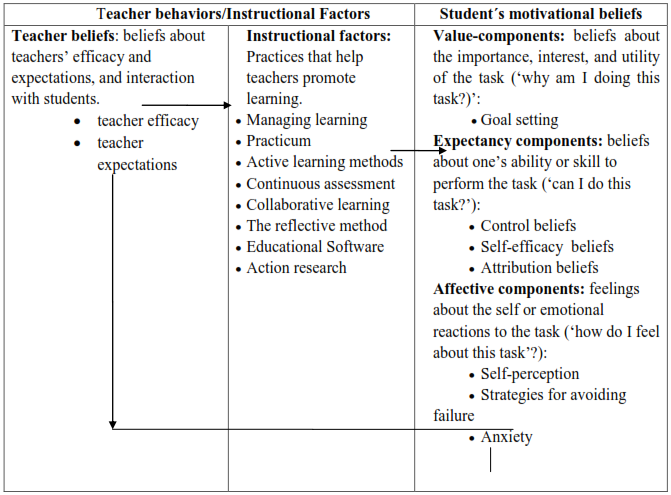 Accordingly, the theoretical review provides a different picture of student’s motivational beliefs and teachers’ beliefs that occur in instructional settings to enhance students’ motivation and learning. These components seem to be important in student’s motivational beliefs and teachers´ behaviours: value components; expectancy components; affective components; and teachers’ behaviors.