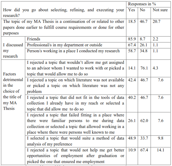 Research topics: Student researchers were given a list of research activities so that they would rate the extent to which the activities are academically challenging to them during research work (see Table 2 above). While only 26% of the participants rated “finding, defining the research topic, objectives” to be not challenging at all or least challenging, nearly 60% of them have rated these experiences to be challenging to most challenging. Attempts were made to specify this problem by asking participants what processes and factors would they consider in the choice of their thesis topics to learn if the participants have the competencies for observing proper practices in the choice of their research topics (Table 3). Of interest to us in Table 3 is the fact that, for the majority of participants, the title considered was not a continuation of previous work, and nearly in one out of four participants relevant professionals outside the department and in the research site were not consulted. It is even surprising to note that the factors considered for picking up their research topics were governed by peripheral factors rather than a commitment to solving an intellectually puzzling problem (see Table 3).