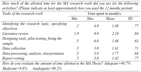 Time management (allotment and usage of time): With respect to time management skills, students were asked about their allotment and usage of the time for the research work in months. Their responses show (mean average of months spent) that the total time allotted for the research was perceived smaller for a meaningful majority. As summarized in Table 4, this could be because of problems in the usage of time; as more time appears to be devoted to literature review. Looking into copies of theses produced, we may find that almost half of the manuscripts in many theses are covered by literature review and yet it is this section that appears to have many problems as the assessment results indicate.