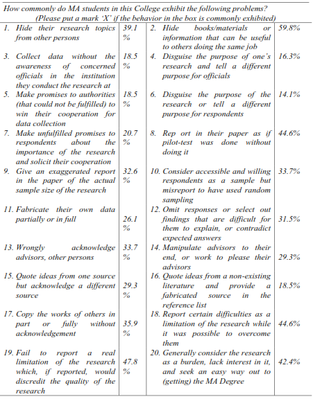 Of all the concerns, we may rather be more preoccupied with violations of ethical code of conduct as indicated in Table 5. Asked how commonly MA students exhibit one form or another kind of ethical problem, students indicated problems that are in fact difficult for assessors to detect. Such perceived violations, of course by others, range the whole gamut of research work; from research topic selection in which students tend to hide their titles to different kinds of problems noted in report writing. For our present purpose, we reiterate students’ responses in Table 5.
