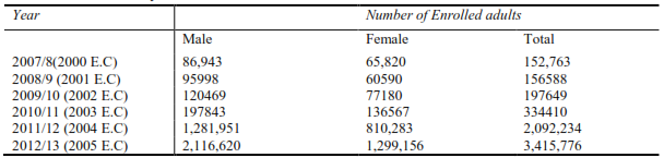 The effectiveness of a certain educational program could be seen by the number of enrollees and their rate of completion. In the Ethiopian context, it was hard to find data about adult literacy as the issue had been included in the Education Statistics Annual Abstract recently.