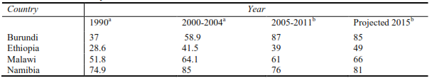Table 2 shows the trend of adult literacy rate in some selected African countries taking the year 1990 as a baseline, where countries affirmed their commitment towards achieving EFA goals. Burundi can be a good example in Africa for the highest record in increment of adult literacy in 20 years. Both Malawi and Burundi are cited for their effective policies in adult literacy which, though not significant in Malawi, has made Burundi increase its literacy rate by 50% between 1990 and 2011 (UNESCO, 2011). Moreover, as can be seen from table 2, Namibia has high adult literacy rate in 1990 which increased by 10% in 15 years and went down to 76 after 5 years. However, Namibia was often cited as a country which has inexpensive literacy policies, strong leadership, clear targets supported by financial commitment (UNECO, 2006). Moreover, Namibia has intended to achieve 90% literacy rate by 2015 by integrating the literacy program with local needs and by decentralizing its process (UNESCO, 2011). As can be seen from table 2, compared to Malawi and Namibia, Ethiopia showed an important increase in its adult literacy rate between 1990 and 2004. In 2011, however, Ethiopia was among eight countries with adult literacy rate at or below 40%. In this regard, Ethiopia as part of Sub-Saharan Africa is unlikely to reach the Education for All literacy target set for 2015 (UNESCO, 2011).