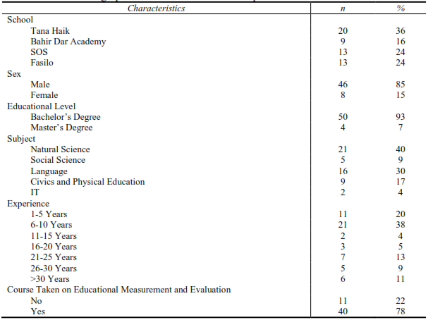 A total of 60 grade 9 teachers from four high schools in Bahir Dar town were randomly selected to serve as the sample of the study. The sample was randomly selected from the total Bahir Dar town high school teacher population. The selection of the sample was done as follows. First, from the total of 8 high schools (four governmental schools namely Tana Haik, Fasilo, Ghion, and Bahir Dar Zuria and four non-governmental schools namely Bahir Dar Academy, ADM (Haile), SOS Herman Gmeiner (SOS), and Aba G/Michael (Catholic)), four schools (two governmental namely Tana Haik and Fasilo and two non-governmental namely Bahir Dar Academy and SOS) were randomly selected using a lottery system. Second, from the selected four schools, on average twenty teachers were selected from each of the four schools mentioned above using accidental sampling based on their number and availability of teachers on that specific day and time of data collection.