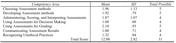 Seen from the point of view of the extent to which teachers met the seven standards, one of the results of this study paralleled both Mertler (2005) and Plake and Impara (1997). The present participants had the most difficulty with Standard 6 (M = 1.00), which is communicating assessment results. Plake and Impara (1997) also found out that inservice teachers scored the lowest (M = 2.70) on this standard. Even though participants in Mertler's (2005) study likewise did not score high on this standard (M = 2.48), the scores were very similar to those obtained in the present study as well as in Plake and Impara (1997). Despite a few similarities among these studies in identifying the degree of assessment literacy for inservice teachers, the present study showed that communicating assessment results was the most difficult standard to meet.