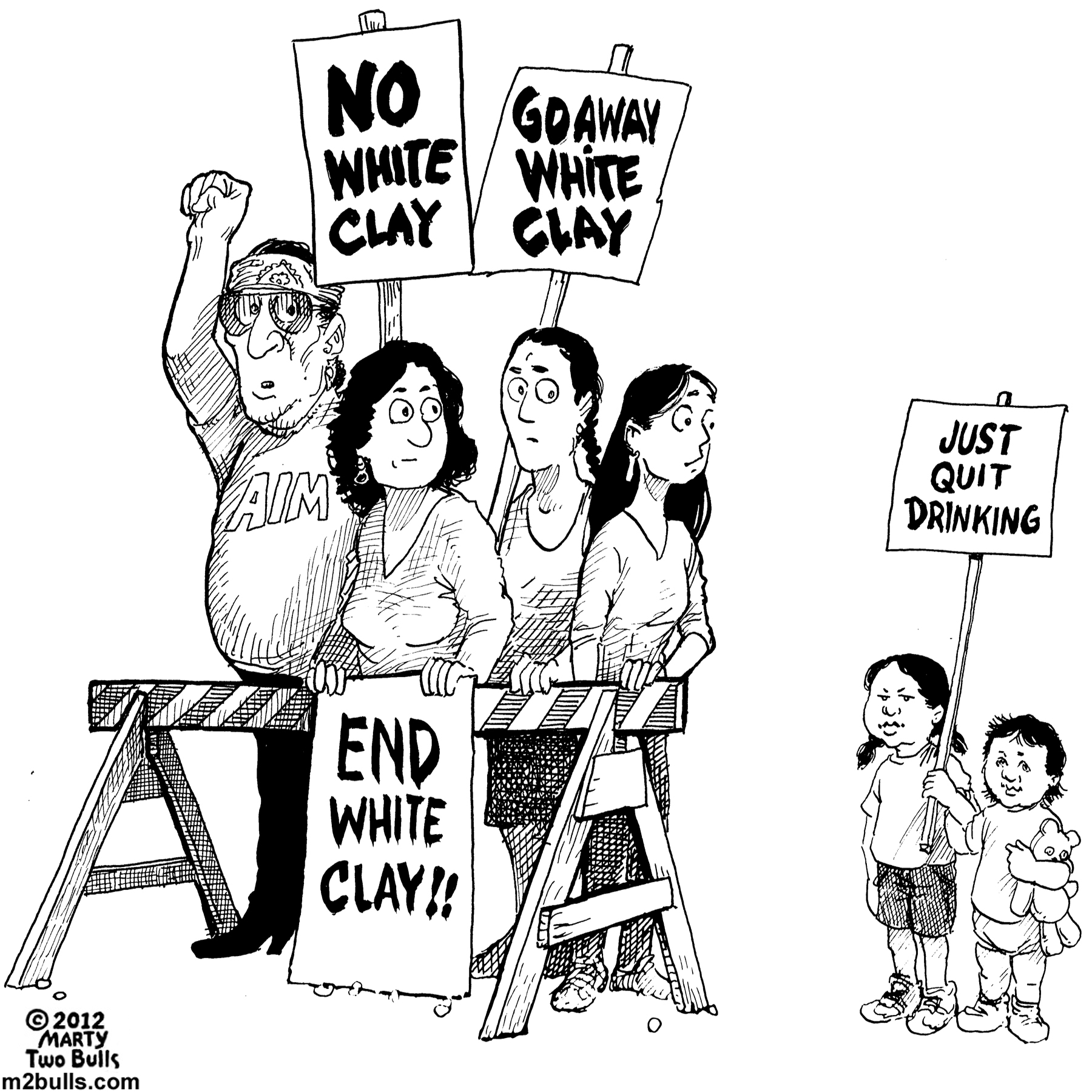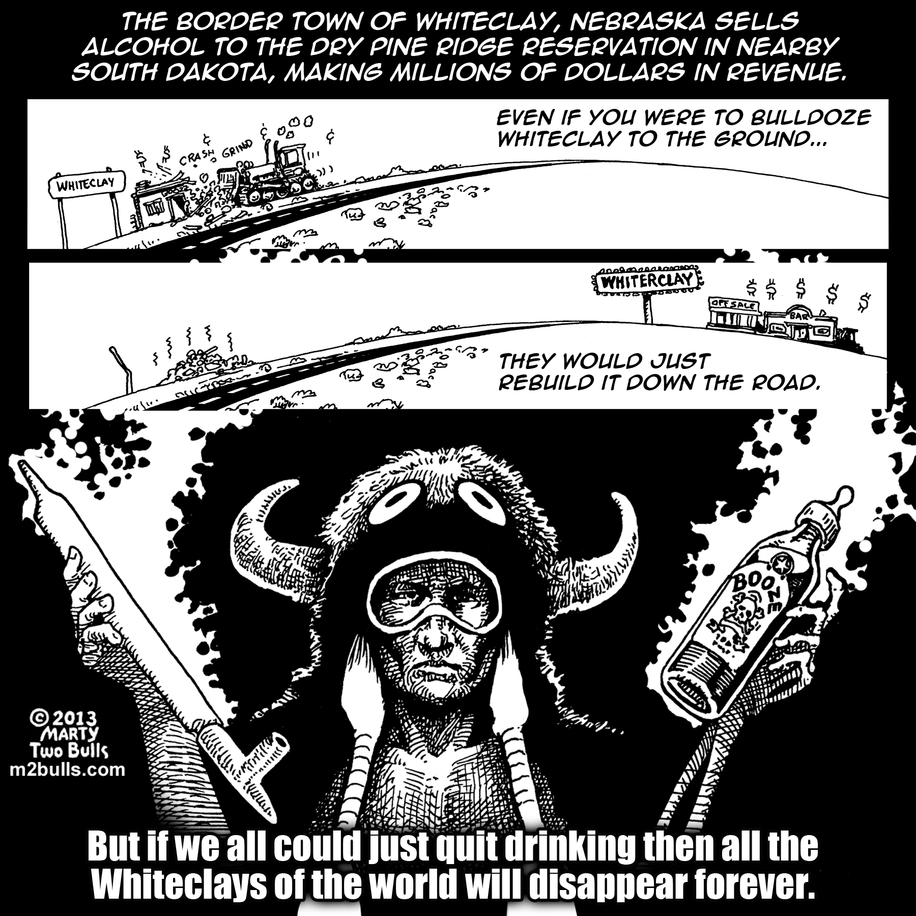 In the past years, efforts to legally lift the alcohol ban in Pine Ridge reemerged with a public referendum held in 2013 and another scheduled for 2016. However, no legal changes have been decided upon or applied. In his cartoons, Marty Two Bulls frequently satirizes alcoholism and the Whiteclay issue. In the years 2012 and 2013, two events inspired Two Bulls to address Whiteclay in his cartoons—a tribal lawsuit against the stores and major beer companies and a referendum to legalize alcohol on the reservation. In 2012, the Oglala Sioux Tribe filed a lawsuit against large beer companies and the four beer stores in the border town. The Tribe demanded 500 million dollars in damages for the cost of health care, social services and child rehabilitation caused by chronic alcoholism on the reservation. In this debate, Marty Two Bulls takes up a rather unpopular position. The popular position in Indian Country and among allies and sympathizers reads as follows: white people destroyed the economic foundation of Lakota life, white people cause the drinking, white people profit from the business; hence, white people should pay reparations. Two Bulls, however, does not join the Native-white dichotomy of good and bad, of victim and offender. What makes his cartoons on this subject—like on other topics he addresses as well—so remarkable, unsettling, and irritating is his honest and very direct message that he unapologetically throws in the faces of his audience, as if to say: don’t blame others, look at yourselves! It is no coincidence that humor is his instrument of choice because making direct accusations is not common in Lakota communities. Just as with the heyoka of latter days, the cartoonist takes up a clownish role when holding up the mirror to let people reflect upon their own behavior.