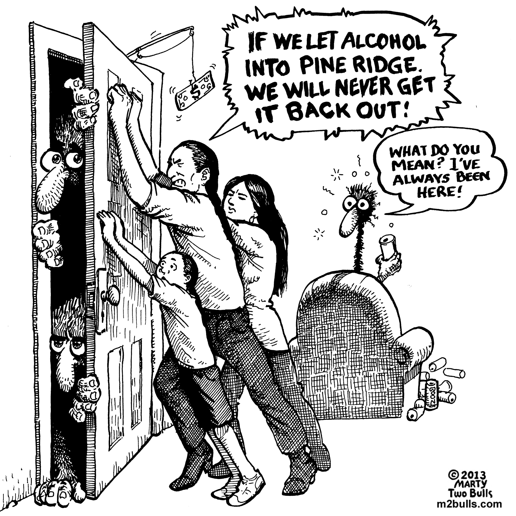 The debate about the OST law suit against Whiteclay beer stores and beer companies again brought up the idea about legalizing alcohol on the reservation. Initiators and supporters of the campaign to lift the alcohol ban argued that de-criminalizing drinking will have positive effects on (“responsible”) drinking behavior and that the tribe could successfully tap into the alcohol business; the revenues gained could be allocated to addressing local needs, including an alcohol treatment center (Simmons-Richie, 2014). The defenders of the ban argued that alcohol would be uncontrollable once legalized; it would increase the amount and intensity of chronic alcoholism in Pine Ridge. In the cartoon depicted here on the left, Two Bulls reminds readers that alcohol is already there, is already part of daily life and in people’s homes. In an interview, Two Bulls indicated that he enjoys pointing out the obvious on some of the controversial issues (Eaton, 2013). In August 2013, a slight majority of Oglala Lakota tribal members voted “Yes” to the legalization of alcohol on the Pine Ridge Reservation. However, no resolution has been adopted by the Oglala Sioux Tribal Council and a new referendum has been scheduled and re-scheduled since, according to Ellen Fillspipe, member of the tribal council and of OST’s Law and Order Committee (interview, 2016).