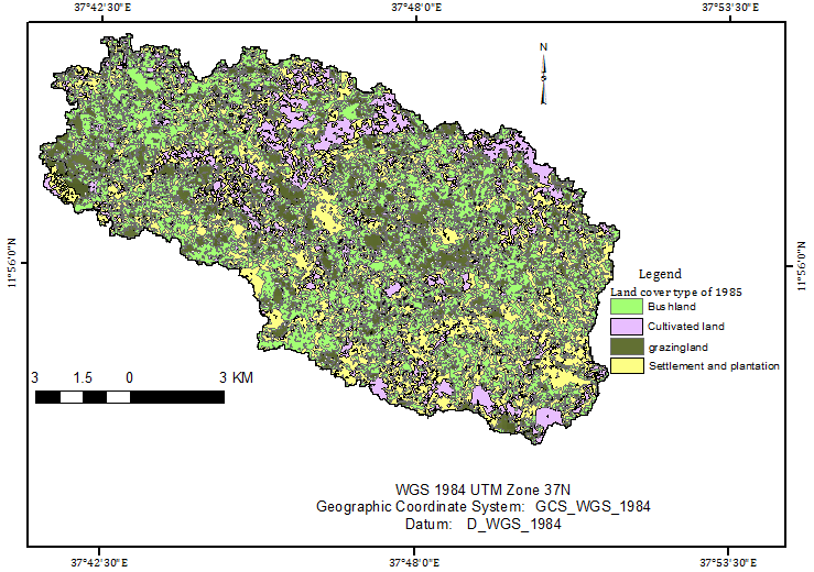 As shown in (Figure 8) between 1973 and 1985, there was a dramatic expansion of cultivated land followed by settlement and plantation, where as grass land and bush land use types showed a reduction in areal coverage.