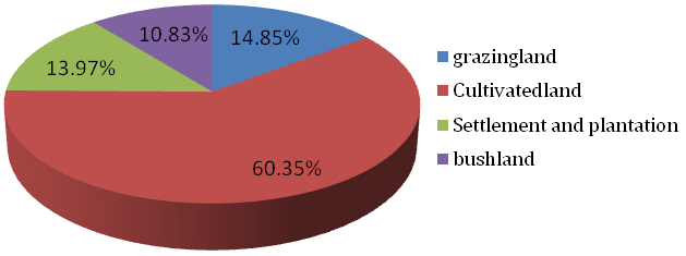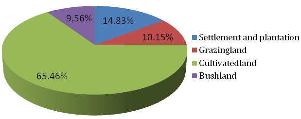 An analysis of the 1999 land use and land cover shows that cultivated land takingthe largest share from all land use type in the watershed. It accounts for about 8952.31ha (65.46%) followed by Settlements and plantation 2028.62ha (14.83%) and Grazing land 1388.48ha (10.15%), respectively. Bush land is the least land cover type in the watershed with a total area of 1307.21 ha (9.56%) (Figure 5). The trend in cultivated land substantiates the continued encroachments of this category on other land use types