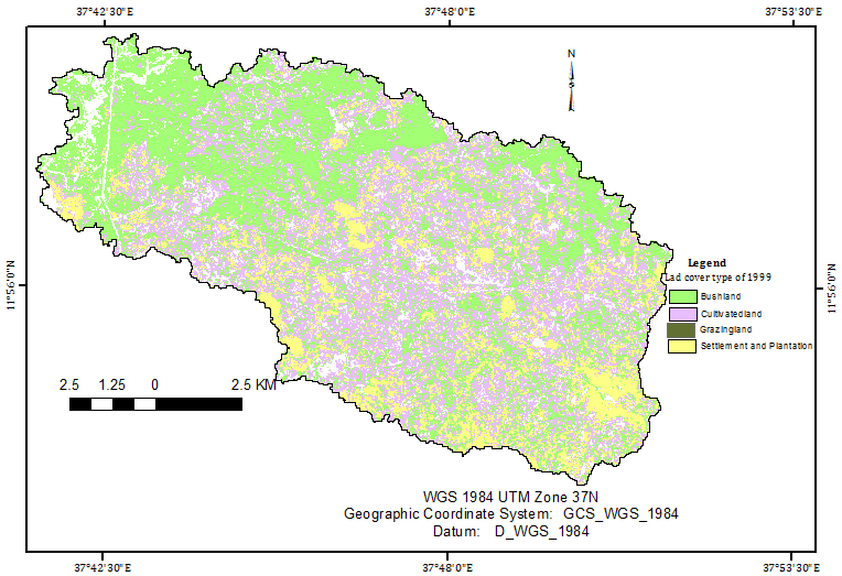 | Land use and land cover type of 1999 | Bush Lands (1) | 49.99 | 40.99 | 984.03 | 231.78 | 1306.79 |