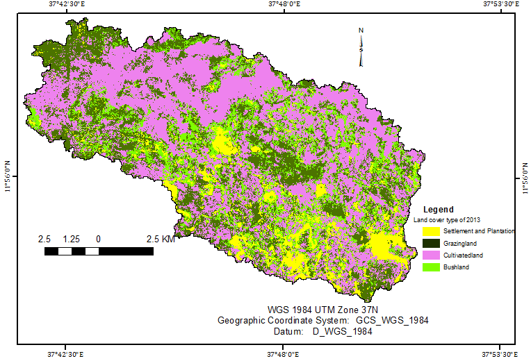 As clear It can be understood from (Figures 5.4a and b) that the largest share of land use in 2013 is under cultivated lands, which covers an area of 9033.03ha (66.05%). Settlements and plantation and Grazing lands cover of 2347.32ha (17.16%) and 1288.48ha (9.42%), respectively. The least areal coverage was of Bush lands, which accounts for only 1007.79ha (7.37%) from the total area of the Watershed. The increase in cultivated land was due to the conversion of shrub and grass lands into agricultural land as a result of the rapid population growth in the study area. In addition, there was expansion of Settlements and plantation because of the high demand for land for housing from the rapidly growing population in the study watershed.