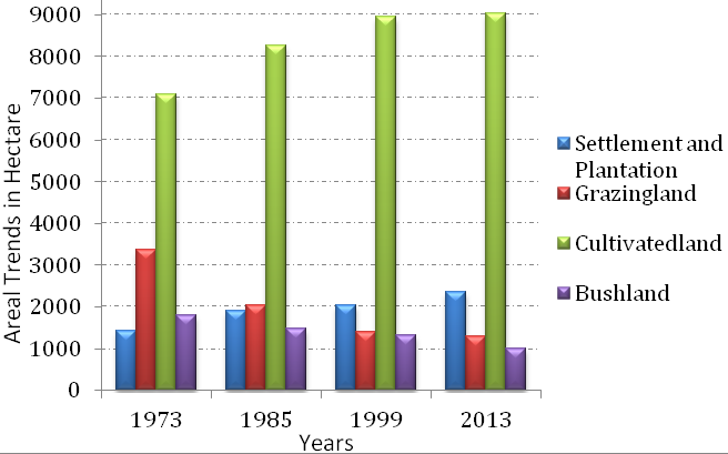 As Table 3 and Figure 6 depict, in the study area, from 1973 to 2013, cultivated land and Settlement and plantation were continuously increasing whereas bush lands and grazing lands were continuously decreasing.