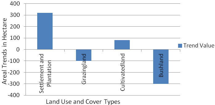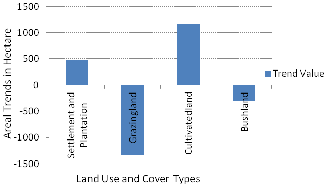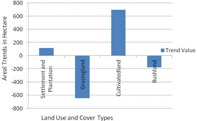 As a result, 1179, 528.64 and 133.23 hectares of grasslands, bush lands as well as settlement and plantation had been changed to cultivated land (Table 5). This shows that there was a dramatic expansion of cultivated land within the specified time period because of population pressure and an increased demand for housing.
