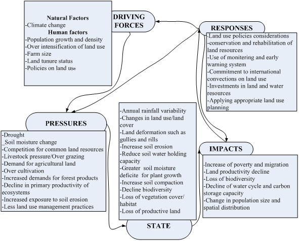Responses are understood in the LADA framework of FAO (2004) as the direct or indirect actions taken by land users and managers to the impacts on their livelihood caused by the state of land degradation, the pressures on the land causing such state, and the driving forces causing such pressures. Therefore, there is a need for land use policies considerations, conservation and rehabilitation of land resources, use of monitoring and early warning system, commitment to international convections on land use, investments in land and water resources and applying appropriate land use planning (Figure 11).