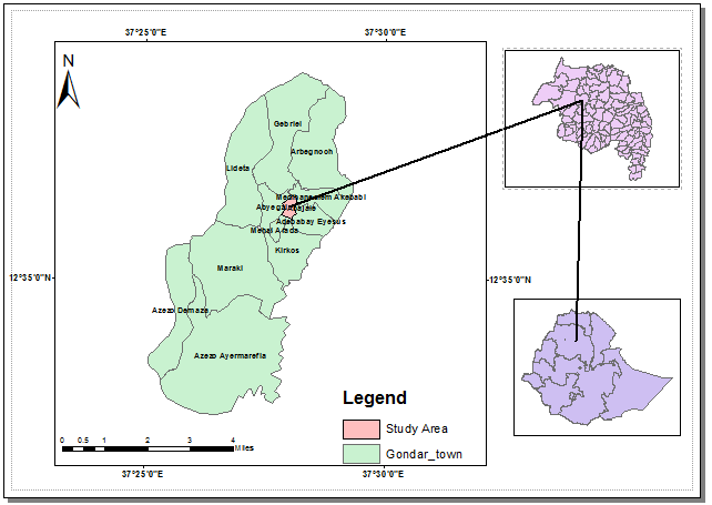 Gondar was founded by Emperor Fasiledes in 1636 A.D. (Berry, 1989). During the time, according to the same source, the town served as the capital city of both the Ethiopian Empire and the subsequent Begemeder province. The city holds the ruins of several royal castles, including those in Fasil Ghebbi , for which Gondar has been called the “Camelot of Africa”. Its latitudinal and longitudinal extension were 12039iN and 37030iE, respectively (Henok, 2014).The total land area of Gondar town is estimated to be about 5560 hectares with a total population of 300,000(EDHS, 2011). Its average elevation is about 2260m above mean sea level and it has sub-tropical climatic conditions (Henok, 2014).The current administration system classified the town in to 13 kifleketemas; each kifleketema comprises two kebeles. The total number of people in Abajale kifleketema (the study site) was 6909. Out of these, 3056 were males and the remaining (3853) were females (Abajale kifleketema administration office, 2014) (see Fig. 1).