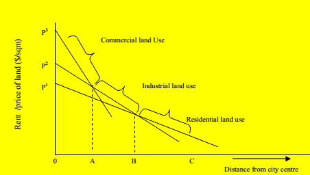 For instance, commercial activities due to the specific requirements of their customers and the need to be next to each other prefer to be located in city centre where transport facilities and agglomeration maximize costumers availability and flow. Consequently, they are willing to bid for the possible highest land prices. On the contrary, industrial activities, even if they want to be as close as possible to the centre, for reasons such as transport and availability of labour and marketing services, the urgency to be located there is less than that of commercial. Thus, they are less willing to pay for high price of land and could not successfully outbid commercials for the very central locations. Whereas, since residential seek use value in the land as opposed to the first two activities that seek profit, they are by far less willing to pay for high price for centrally located sites. Hence, they outbid neither the industrial nor the commercial.