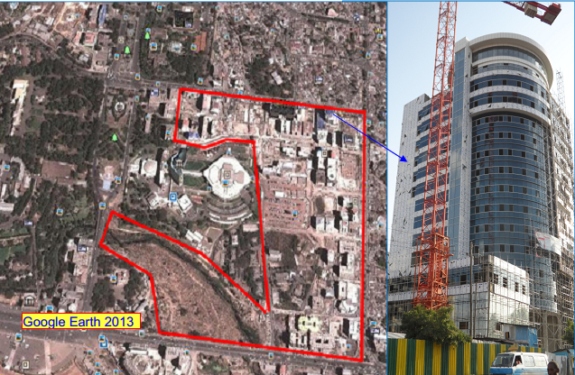 Accordingly, implementation was started by assembling about 25.25 hectares of land following the demolition of about 1102 housing units and displacement of about 5522 people in two phase: from 2000 to 2005 and from 2010 to 2011. Out of the total land assembled or expropriated, about 68% was publicly owned while the remaining 32% was privately owned under the permit hold system (LDP, 2002). Once the site clearance and relocation process was over, the land was parcelled into plots for different purposes: lease auction, negotiation, free transfer, green and parking spaces, and roads and infrastructure provision. With redevelopment came visible change in the physical and socio-economic make-up of the Casa Inchis I project site. The slum does not exist anymore. Casa Inchis which once was the 'symbol' of low-density neighbourhood with dilapidated socio-economic conditions is now Addis Ababa's show-case for modern high-rise commercial and international centre.