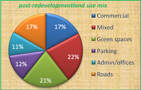 Once the house were demolished, households displaced and relocated, the land was parceled into various land use purposes (phase three). Accordingly the new land use plan depicts, from the total 252,538 m2 of land, commercial use accounts 43,638 m2 (17%), mixed use 56,352 m2 (22%), green space (park) 53,125 m2 (21%), parking space (including ECA parking) 30,624.2 m2 (12%), offices and special land use (for government and non-government organizations) 26,586 m2 (11%) and new and up-graded internal and access roads/pathways 42,212.8 m2 (17%). Excluding the land allotted for infrastructure, green spaces and parking; the percentage share of commercial, mixed and office amounts at 34%, 45% and 21% respectively. If this is compared to the land use situation before redevelopment (see figure 8), substantial change in land use can be observed. Before redevelopment about 15.7 ha (68%) of the land was occupied by low income residential, 1.2 ha (5.6%) small business, 4.3 ha (18.4%) mixed (residential and business) while offices, unused land, riverside 'vacant' spaces shared the remaining 1.8 ha (8%).