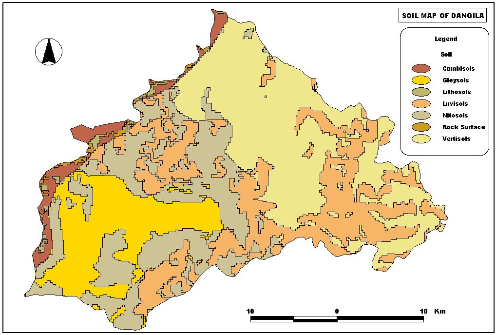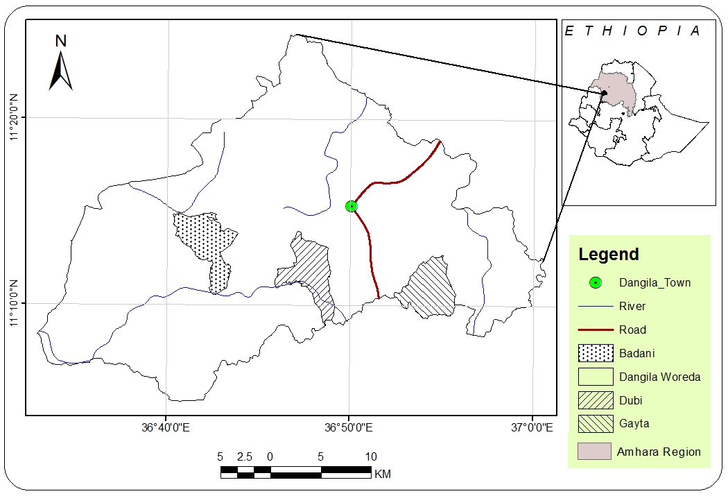 The study district (Dangila woreda) is located, between 11o04’48’’-11o24’36”N latitude and 36o34’48”-37o00’37”E longitude (Fig. 1); approximately 480 kms to the northwest of Addis Ababa, the capital city of Ethiopia. Dangila woreda is 918.4 km2 wide (CSA, 2010), and its elevation traverses between 1500 and 2400 m.a.s.l. (Belay, 2013). Volcanic materials mainly belonging to the quaternary and tertiary formations overlying the older geological formation of the ancient eras dominate the area (e.g. see Arndt and Menzies, 2005). Lithosols, Nitosols, Vertisols, Luvisols, Gleysols, Cambisols and rocky surfaces are major soil covers in the district (Fig. 2).