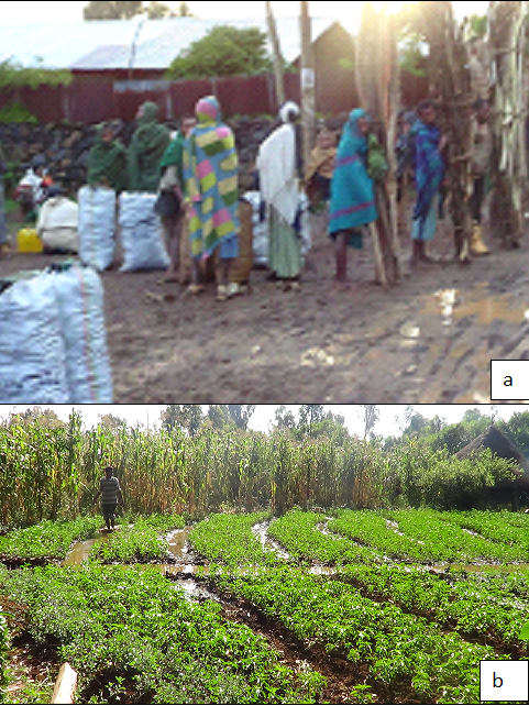 Fig. 3. a) Farmers selling charcoal and firewood in Dangila town (June 2012), and b) Maize and potato growing on irrigated homestead farm in Gayta (Oct. 2012)