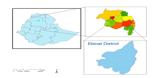 A field experiment was conducted under rain fed condition during the main cropping season (April 2012 to April 2013) at Fakoy site in Debir Abajalie Peasant Administration of Ebinat District, Amhara Region on farmers’ field. Ebinat District is located between 110 and 120 North latitude, and 370 and 380 East longitude (SERA, 2000). The mean annual rainfall of the District is 600-800 mm while the monthly mean temperature of the district is 180C (SERA, 2000). The elevation of the experimental site is 2100 m above sea level (asl). The analyzed soil physico-chemical properties of the experimental site are indicated as (Table 1). The land used for the present field experiment had not been fertilized for over the last two years with either organic or mineral fertilizers. Map of the study area is depicted here below in Figure 1.