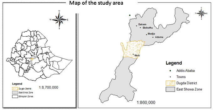 This research was carried out in Dugda, a district which is found in eastern Shewa zone of Oromiya National Regional State. The study area is located at a distance of 130 km from Addis Ababa. Multi-stage sampling technique was used to draw the sampling units of the study. Formal survey was conducted with onion producers. At the first stage, Dugda district was selected purposively due to extensive coverage and production of onions in the district. Melkasa and Adami Tulu Agricultural Research Centers have released improved onion varieties particularly for the study district and improved agricultural inputs utilization as well as conducting wide demonstrations on onion cultivation in Dugda district. Onions were selected as the most important crop to be considered for the purpose of this study due to the fact that it is high-value commodities and are mainly produced in Dugda district and in Ethiopia as a whole. Onions are major vegetable products that are exported as cash crops. In 2015/2016 production season, out of the total area of the district 95,945 ha, total cultivated land was 55,828 ha of which 10,937 ha were covered by onions implying relatively it covered second large area next to tomatoes compared to other vegetables (BoARD, 2015).