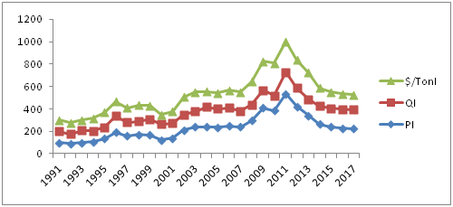 The results showed that cocoa export exhibited an oscillating trend during the period 1991 to 2017 with the least ebb quantity exported been 1.06 million MT in the year 1992, representing 86.04% of the base year and the maximum peak exported been 2.407 million MT in the year 2011 representing 195.05% of the base year (Table 1a and Figure 1). Similar results were observed for the export value across the study period. Furthermore, the quantity of cocoa exported and export revenue generated during the stipulated period increased by 33,661.2 tons annually, representing 1.9% of the average quantity of African cocoa export; and increased by $1.27 billion annually, representing 4.31%of the average African cocoa export revenue during the study period (Table 1b).