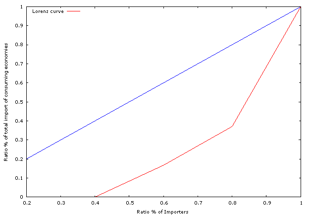 If the area between the line of perfect equality and Lorenz curve is A, and the area under the Lorenz curve is B, then the Gini index G =A/ (A+B), since A +B = 0.5